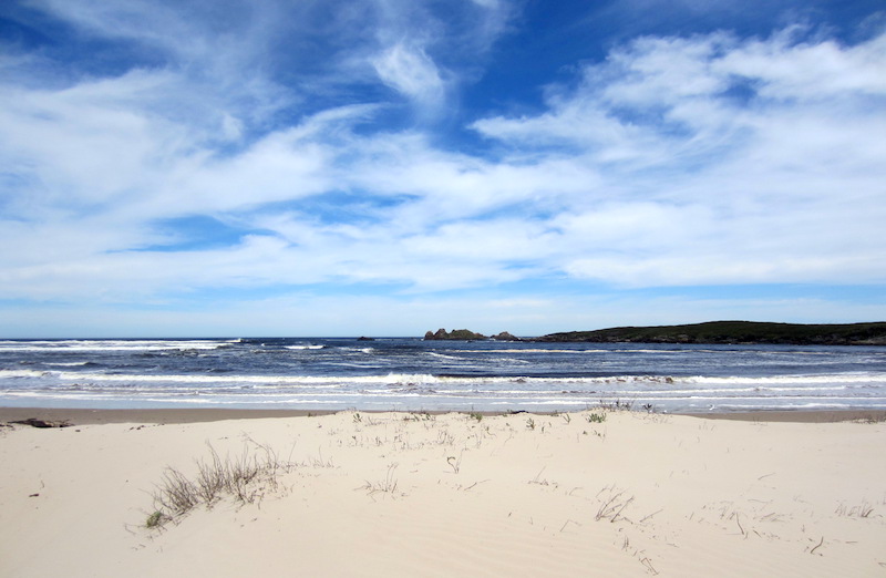 The mouth of the Pieman River, looking west across the Indian Ocean.