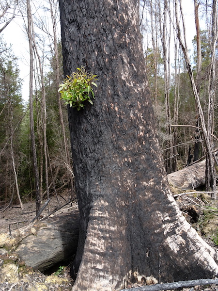 Burnt eucalyptus. The epicormic buds part way up the trunk signal the tree is still alive.