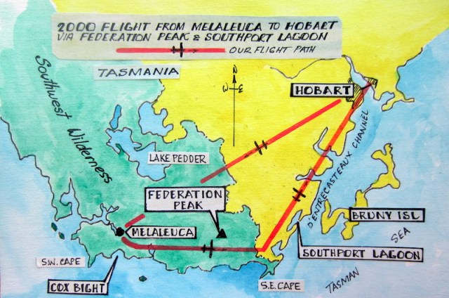 In 2000 we flew along the south and east coasts of Tasmania en route to Hobart after having spent time walking the Southwest Cape region. On the return flight we saw for the first time Federation Peak and the remote Southport Lagoon. The previous map shows Southport Lagoon and Federation Peak (at the bottom right corner of the map) and the following map shows our flight path from Melaleuca. At Melaleuca there is a dirt airstrip suitable for light aircraft and is the only airstrip in the SW Wilderness.