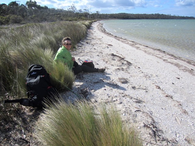The Ida Bay train left and we walked back along the track, dropped down onto the beach and made it back to base camp late afternoon. During the day we experienced what felt like seven winters and seven summers and each time we changed from winter gear to summer gear and back. At basecamp the wind was still blowing strongly, I estimated it was at times around 50kph with gusts to 65kph. The wind was whipping up sand around our tent and we couldn’t help but think of the desert Berbers of Morocco. Quite a number of people I know would have felt very uncomfortable in such conditions but when it is not as comfortable as one would like I always think of what my mother used to say, ‘count your blessings’. Our blessings were the absence of Delhi belly, toothache, the flu or a cold and it wasn’t raining.