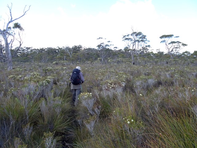 The walk from the terminus to the lagoon was a typical wilderness track. There were no improvements and in places the track was how tracks were before they were improved to suit the ‘high-heeled brigade’, tourists who attempt to walk some tracks in totally inappropriate shoes. The track passed through eucalypt woodlands, button grass plains, low coastal heath and across the occasional peat bog swamp. Fortunately they were not excessively wet.