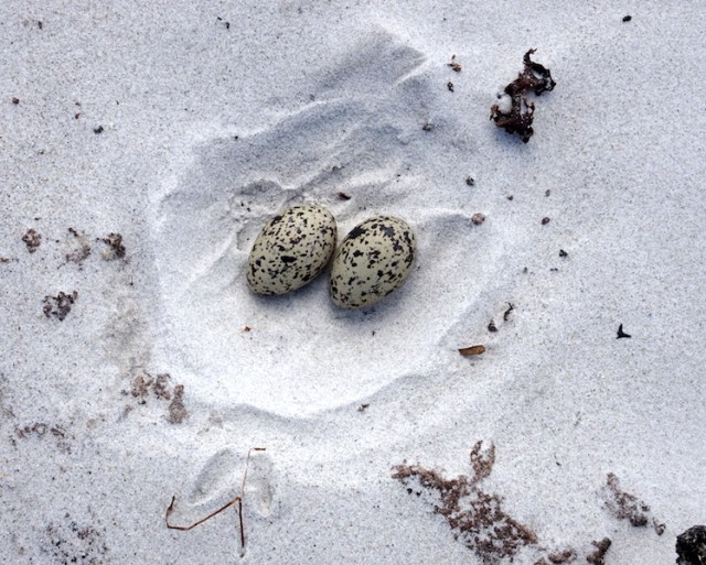 When walking remote beaches it is best to walk just below the high tide line especially at this time of the year when waterbirds are nesting. On the beach walk today Bev came close to an oystercatcher nest. Hardly a ‘nest’, it was simply a depression in the sand.