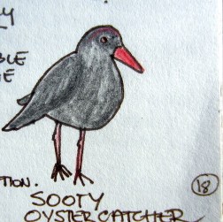 Oystercatchers are shy birds and if approached they move on, keeping just out of photographic range. There are two oystercatchers in Tasmania, the pied and the sooty. It is thought pied oystercatcher numbers have declined and the current population could be as low as ten thousand. Following are two images from my birds of Tasmania notebook circa 2003.