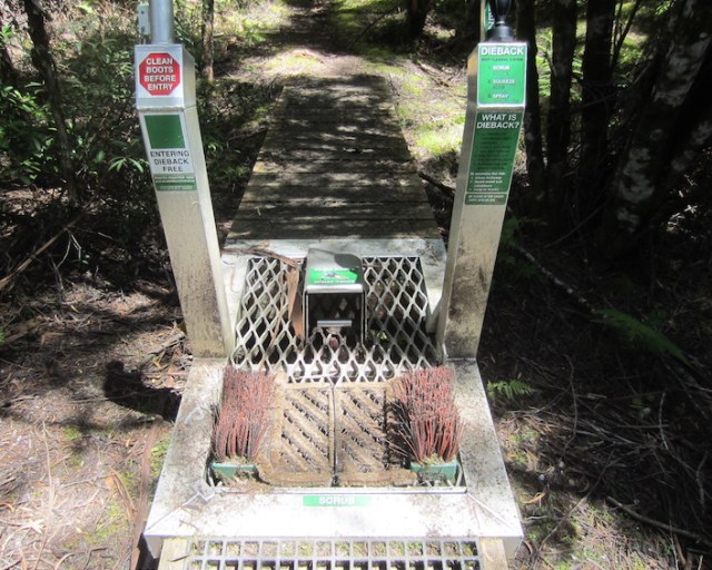 To stop the spread of Phytophthora, wash-down stations have been installed on some tracks and prior to going into or out of the wilderness walkers are encouraged to thoroughly clean their boots. Bev and I also clean tent pegs, walking poles, camera tripod feet and even the underside of our tent.