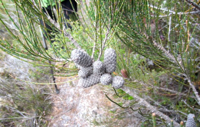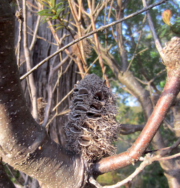 Fire has triggered the opening of the follicles and the release of seed from this banksia fruiting structure. These dried cones provide the basis for the appearance of the bad banksia men in May Gibbs’ Gumnut stories…hairy, knobbly and many-eyed creatures.