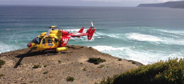 The rescue helicopter landing pad between the banksia in the foreground and the Landrover in the distance.