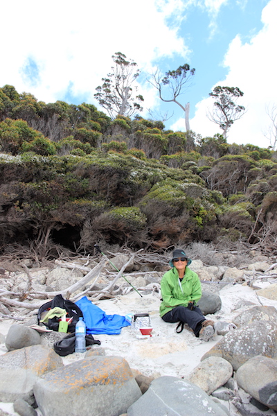 Lunch spot on the wave-shaped boulders and a wombat tunnel behind Bev to the left.