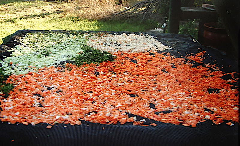 Vegetables spread thin on the makeshift drying table, an old bed with shade cloth on top.