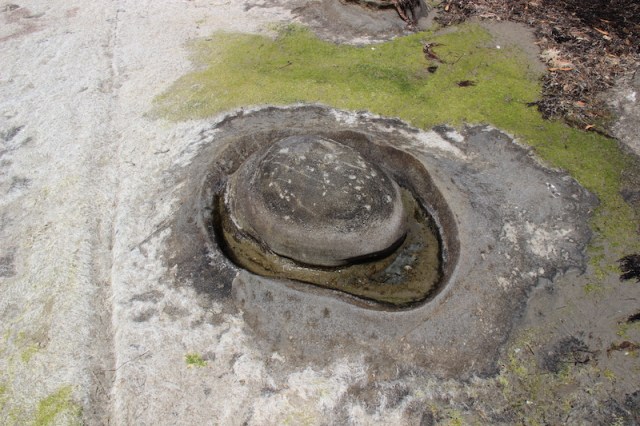The geological explanation relating to these formations is somewhat complicated so I sent copies of the images to Dr Luke Milan at the University of New England and his reply was: ‘They are looking like concretions to me. This is where after a sedimentary rock is formed, fluids move through the rock via the pore spaces (open spaces between the packed in grains of sediment and minerals), new minerals can precipitate cementing the grains together. This makes the rock far harder and more resistant to weathering than the surrounding rock, thus they stand proud and obvious. They are usually cannon balls in shape but you can get lots of weird shapes’.
