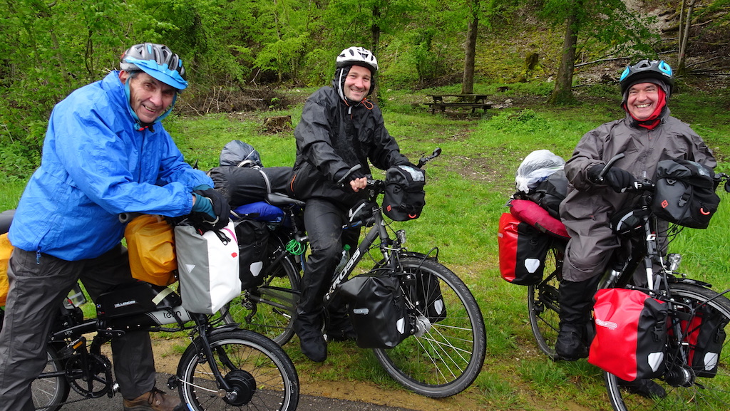 Fellow travellers dressed for the squally showers. They do seem to be carrying a lot of gear. They camped the night by the picnic table in the background.