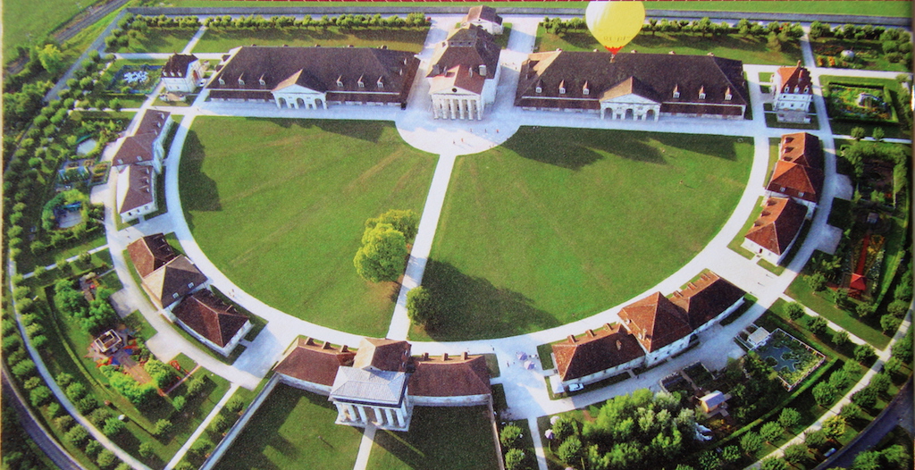 An aerial view of the Saline Royale. The grand entrance is in the middle bottom of the image and the Director’s House is in the middle top of the image just to the left of the yellow hot air balloon.
