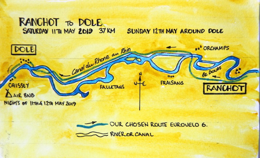 Ranchot to Dole along the Eurovelo 6 following the River Doubs and the canal joining the River Rhine and Rhone.