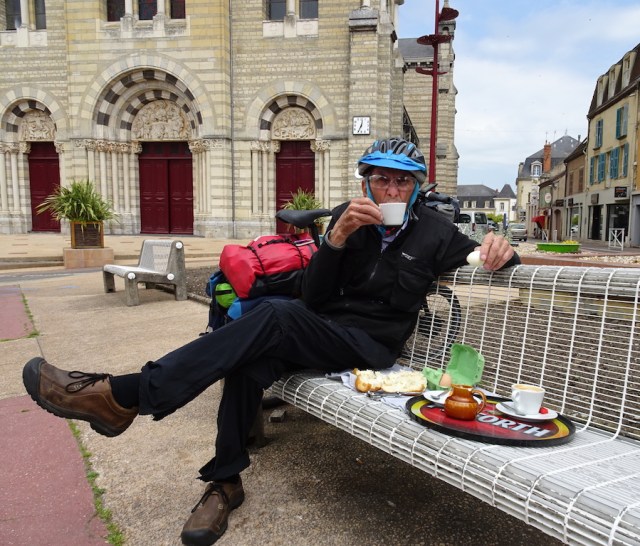 Waterproof pants purchased we continued along a canal to the riverside town of Digoin. It is not often you can go to the local café and order drinks and the owner gives you a takeaway tray. I wanted to sit in the sun in front of the Notre Dame de la Providence Church and admire the perfect setting. This was living!