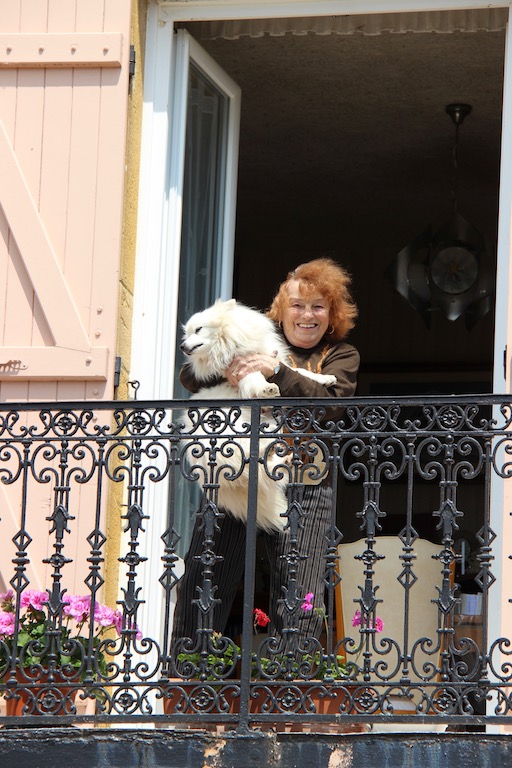 A local showing off her dog in Digoin. An affectionate term for a cat or dog is a furbaby.
