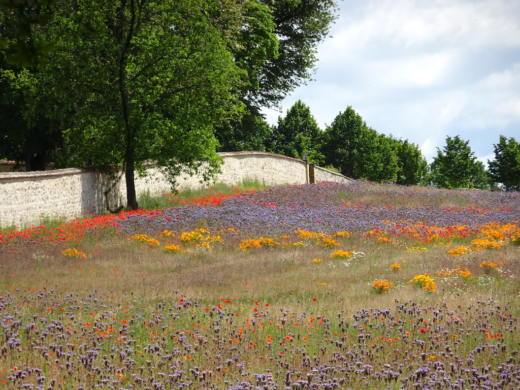 A field of wildflowers outside the walls of an estate.