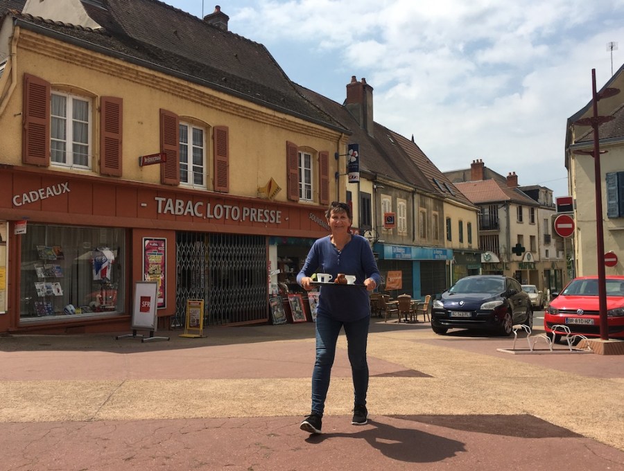 Bev bringing the refreshments from the cafe to our seat in the church square.