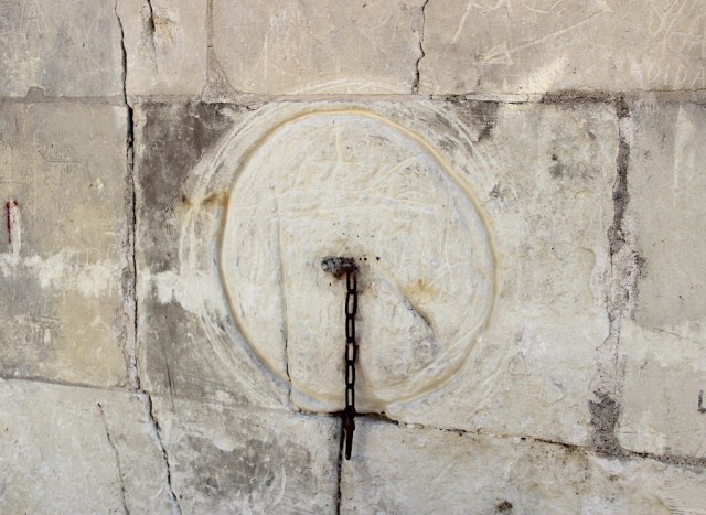 Groove etched into the wall by a wind blown chain, or maybe children on their way home from school have used the chain to their amusement.