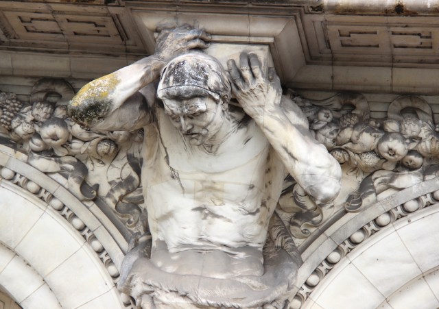 Atlas the Titan was forced to hold the sky on his shoulders for eternity. The pose and expression of Atlas very often shows the effort to bear the heavy load of the building above and the head is bent forward with forearms lifted to provide additional support.