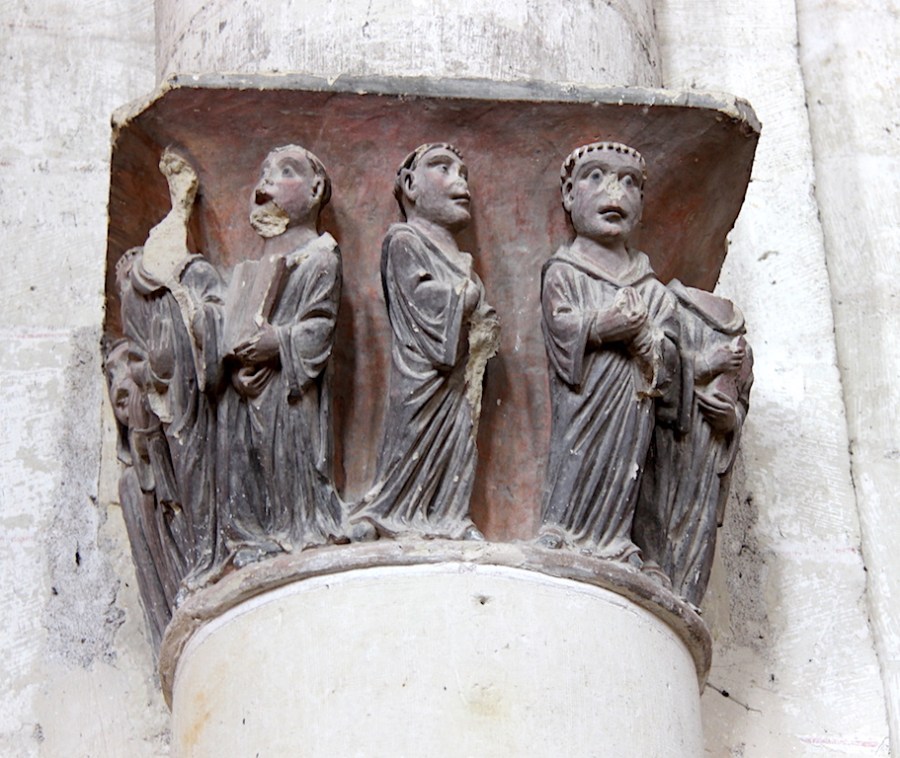 Nose-less figures forming a capital on the church of Notre Dame of Cunault.