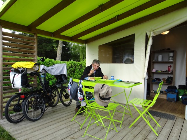 Almost every village in France has a municipal campground, especially those along the designated cycle paths. At the onset of summer when more cyclists are out riding some camp managers set up temporary marquees in which cyclists are able to shelter. The camp at Oudon was no exception.