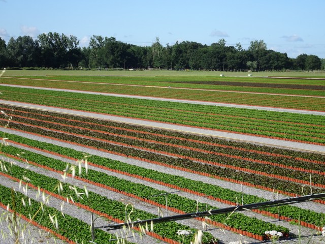 Market garden seedlings in individual pots adjacent to the cycle way. It is impossible to guess how many potted plants were in this field.