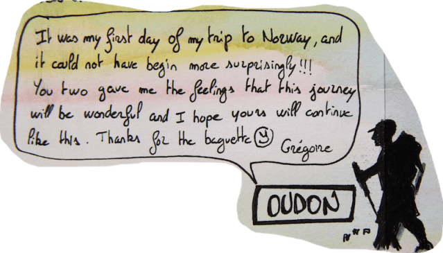 Gregoire was on his annual university break and he decided a good thing to do during the holidays was to walk from France to Norway, approximately two thousand kilometres. Bev and I have passed many walkers; one was actually walking around the world, the ultimate challenge for the devoted hiker. I will write about this man in a future post. When it comes to walking versus cycling, cycling wins hands down. It takes less energy to cycle one kilometre than it takes to walk a kilometre. In fact, a bicycle can be up to five times more efficient than walking. In addition, cycling is much easier on the body as you carry your luggage on the bike, whereas when you walk you carry it on your back.