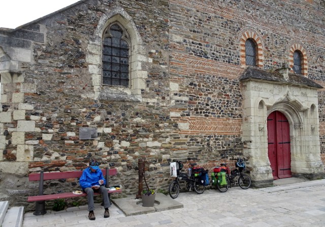 A great spot for lunch outside the church of St Peter and St Roman Savennieres, surrounded by a conglomeration of stone and brick.
