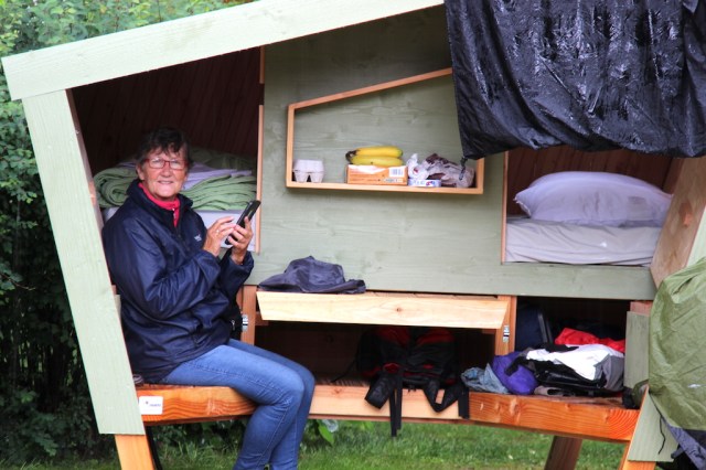 Accommodation took the form of a small caravan, gutted and tastefully renovated, as it was raining and cold and we didn’t want to get our tent wet. A wet tent adds to our weight and if left wrapped for any length of time mildew takes over. A point of interest is mildew grows on surfaces whereas mould grows on food. Returning to the reception we dined on chicken curry then retired to a warm bed.