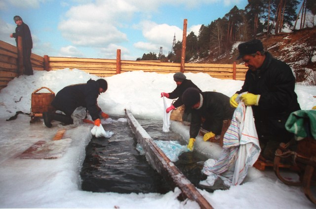 A cold water wash in the Vaga River near the posad town of Verkhovazh’ye, Arkhangelsk region, 2006. The Vaga River connects Central Russia with the White Sea.