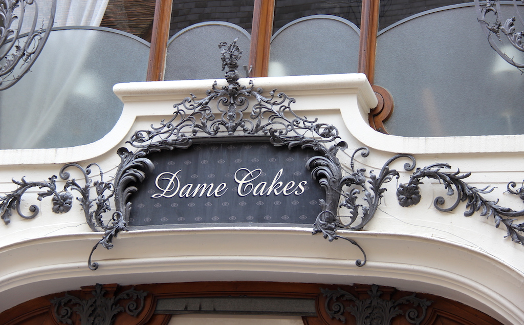 The decorative cartouche on the Dame Cakes tearoom.