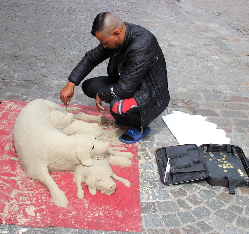 A Bulgarian creating street art in sand. At the end of the day he shovels up his art and takes it away for use another day.