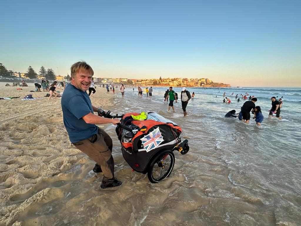 Tom at Bondi beach Sydney at the completion of a 4000km trek from Perth in WA across the Australian continent to Sydney.