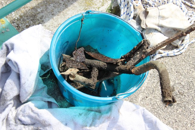To elaborate on taking a chance, sometimes magnet fishers snag WW1 explosive devices, including incendiary bombs containing toxic mustard gas. The ultimate aim is to catch a medieval sword inlaid with valuable gemstones, but I think most of the snagged items are worthless. The following photograph shows a bucket of booty. As a memento I was given a steel key from a sardine tin, something I will treasure.
