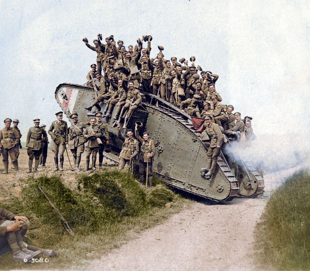 A British tank returning from battle loaded with Canadian soldiers. Image credit: Canadian War Museum. Image colourised by Colourage