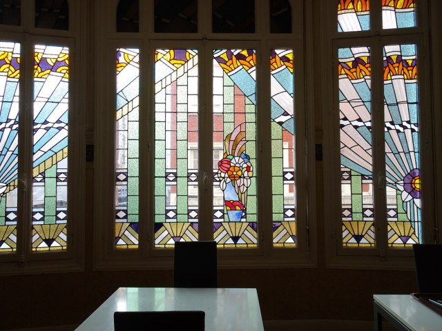 The leaded glass windows in the breakfast room of the Hotel Normandie. Having breakfast in this delightful room was a far cry from porridge in our tent on a wet morning!