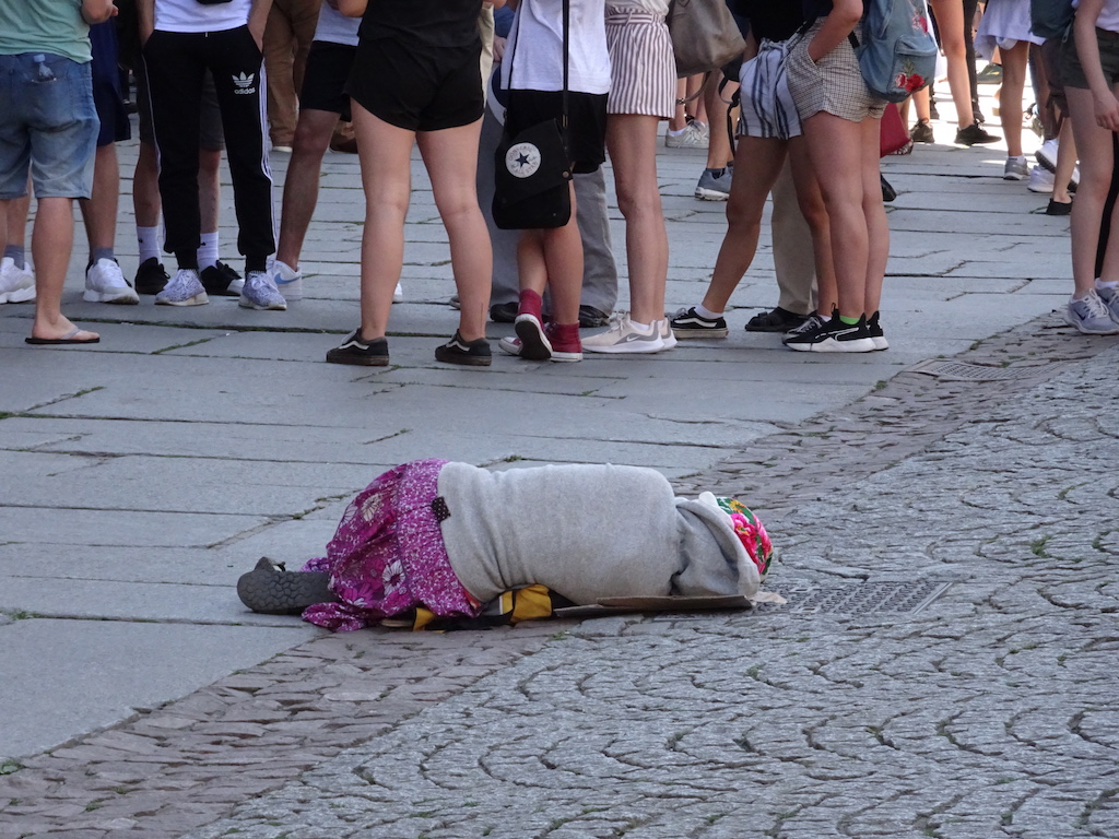 Tourists’ feet outside the Cathedral of Our Lady of Strasbourg. They appear to be untroubled by the plight of the beggar.