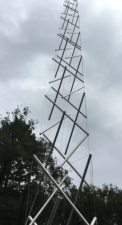 The tower sculpture is made from aluminium tubes in compression and they are held in tension by stainless steel cables threaded through the end of the tubes. If you have the desire to learn about the mathematics involved with creating the tower, go to en.wikipedia.org/wiki/Tensegrity
