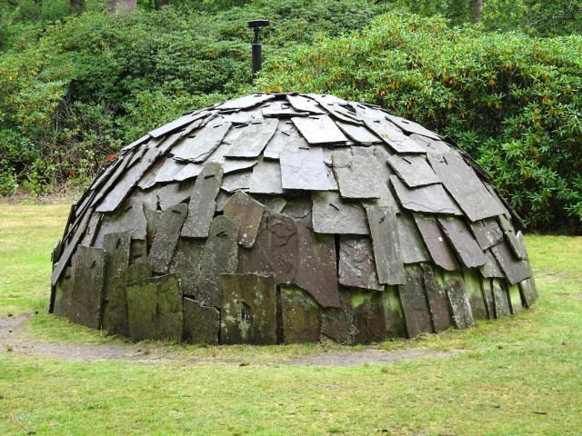 Among a number of interesting sculptures in the gardens is the Igloo by Mario Merz. It is constructed with thin sandstone slabs attached to a steel tube structure. To me, the igloo is a half geodesic dome. Geodesic domes are based on triangles and they can therefore support heavy loads.