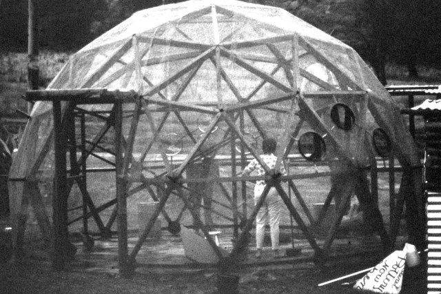 In the early 70’s local potter Geoff Walker designed and built a dome/gallery near our village. His calculation ratios were to the 6th place and he describes the construction as ‘a 3 frequency, alternate breakdown five-eighths dome with wood struts, metal hubs and ferro-cement skin’. Very technical!