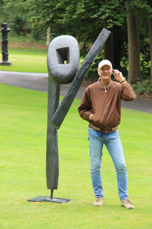 Richard keeping in touch next to one of the sculptures in the Dutch Hoge Veluwe National Park, not far from the border to Germany.