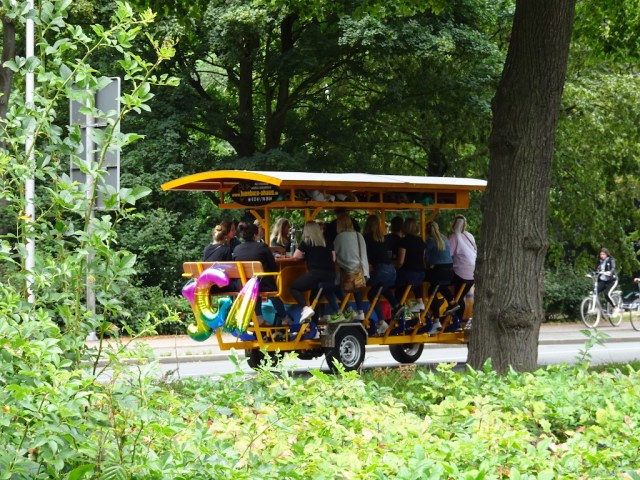 If you want to have a party and still cycle you mount a machine like the one in the above photograph. Partygoers sit opposite each other, pedal and socialise as they go.