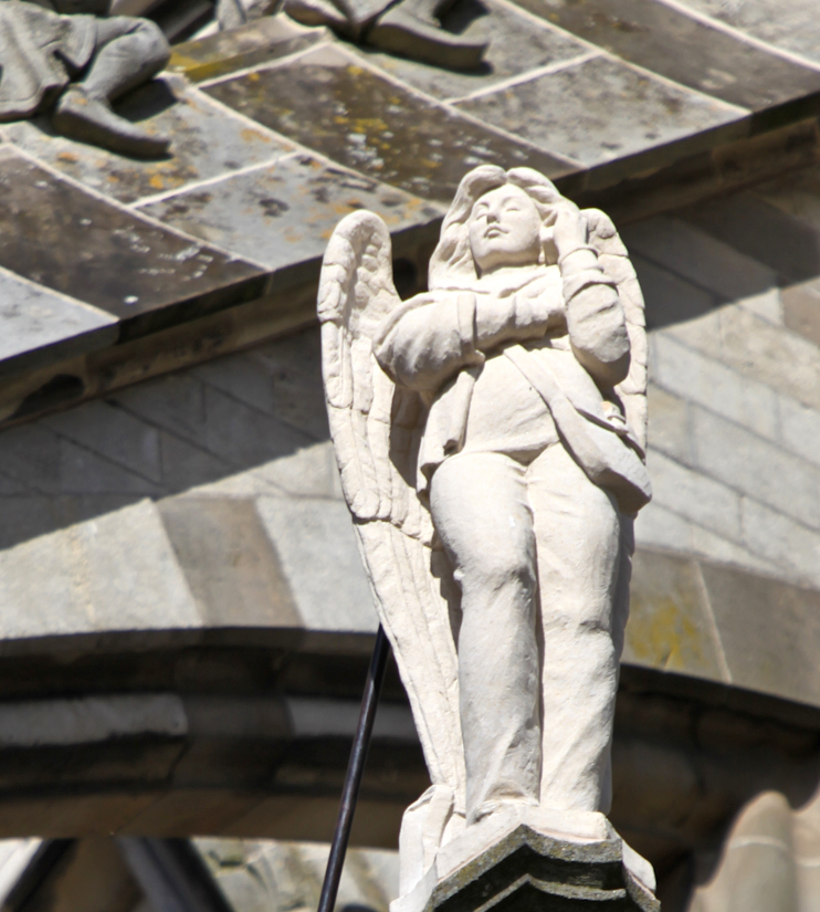 An angel with a mobile phone, a new addition to the medieval statues adorning the Cathedral of St John. Image: en.wikipedia.org
