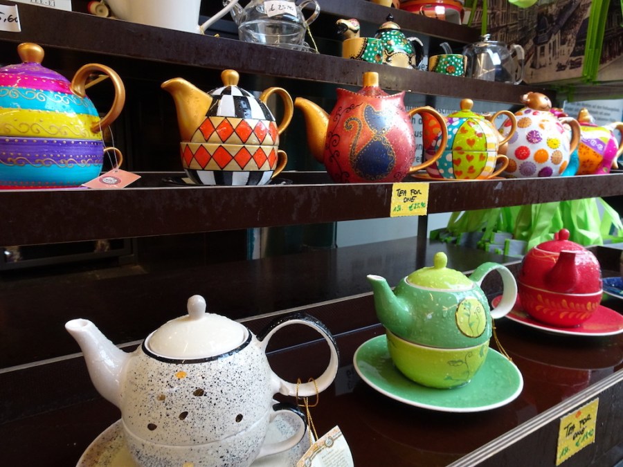 Colourful teapots.