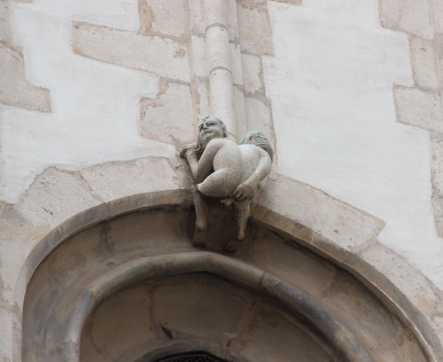 There are many explanations as to the origin of the Indecent Little Man and they involve church rivalry between the Church of St James (the one on which the ‘mooning boy’ is located) and the Cathedral of St Paul and St Peter. I will not relate all the theories but one seems reasonably plausible. As the churches were nearing completion it became obvious that the tower of the Church of St James was going to be higher than that of the Cathedral of St Paul and St Peter and so the stonemason at the Church of St James thought a ‘mooning boy’ was appropriate to point out the fact, like thumbing one’s nose at the loser.