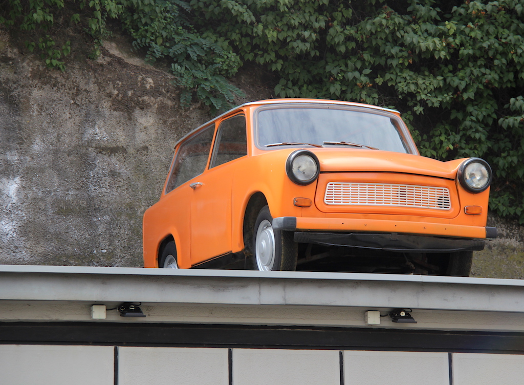 A Trabant on a roof. This is an East German equivalent to the VW Beetle.