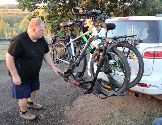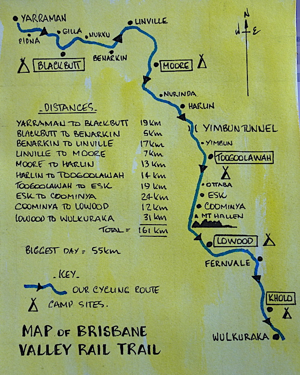 The following day was spent preparing our bikes and camping equipment. Our bikes were loaded onto Debbie and Wayne’s car ready for an early start the next morning. Not only did they supply us with a bed and meals but they delivered us to Wulkuraka (the end of the BVRT) where we were to be collected by Out There Cycling, a shuttle bus service which would take us and our bikes to the start of the rail trail at Yarraman.