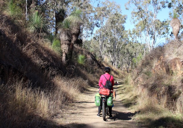 According to the brochures the Brisbane Valley Rail Trail has had the steel rails and sleepers removed and they have been replaced with compacted granite. Roads and bike paths in Australia are nowhere as predictable as they are in Europe where we had been riding in the years before the pandemic. The changeability of conditions and poorer quality bike paths in Australia generally have made us reconsider the suitability of the twenty-inch wheels of our Tern fold-up bikes for Australian conditions. An upgrade was called for and we are now riding bikes with 26-inch wheels, which ride more smoothly across potholes, washouts and rough surfaces.