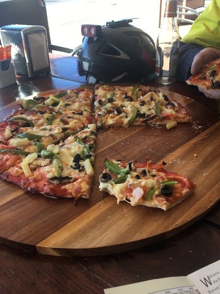 While having our pizza several people spoke with us, ‘where are you going and you are coming from.’ One lady told us an interesting story about her recent double lung transplant and upon enquiring she told us her condition was caused by being underground in the gold and coal mines in central Queensland. I asked what she was doing underground because I assumed underground mining was usually men’s business. It turned out she was a surveyor’s assistant and after working underground for many years, emphysema developed. I then asked what her life was like now, does she appreciate life more and her reply was a definite yes. I suggested to her it was like being in a heavy storm and coming out into clear blue skies. She agreed.