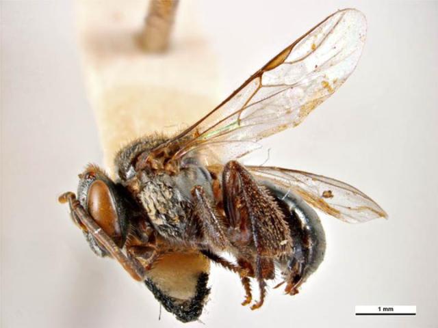 A native bee (Tetragonula hockingsi) drone. This chap is about five mm long. Image credit: Ken Walker Victorian Museum via Wikipedia.