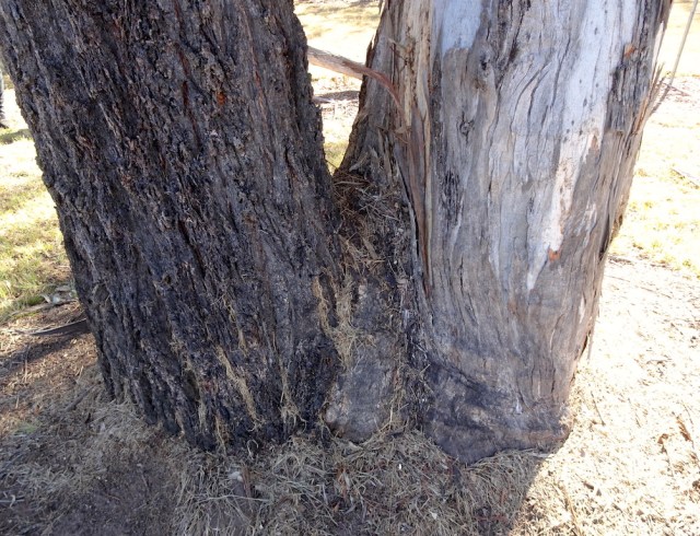 The town of Blackbutt is named after the blackbutt eucalypt tree (Eucalyptus pilularis) which grew profusely in the area and harvested for its timber. There was one growing near the bee boxes, which caught my eye because it was joined to a smooth-barked gum. The question was, were they two separate trees or by a freak of nature had they become one. I asked around and nobody could tell me, neither the bee lady nor the caretaker of the campground.